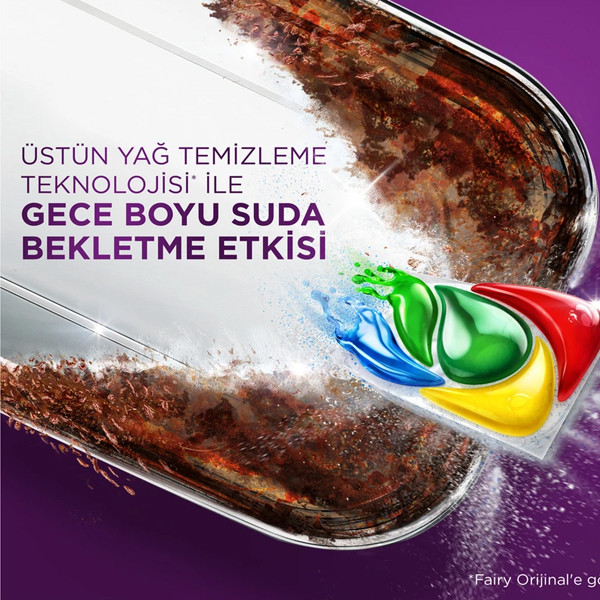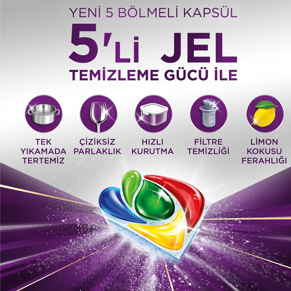 ✓ فرمولاسیون Hepsi Bir Arada: قرصِ همهکاره حاویِ پودرِ شوینده، ژلِ چربیزدا و پاوربالِ براقکننده.